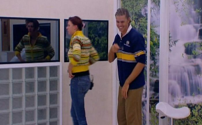 6.12pm - The housemates have a jumprope outside with the garden hose. David runs through it without jumping, provoking lots of yelling from the other housemates. |