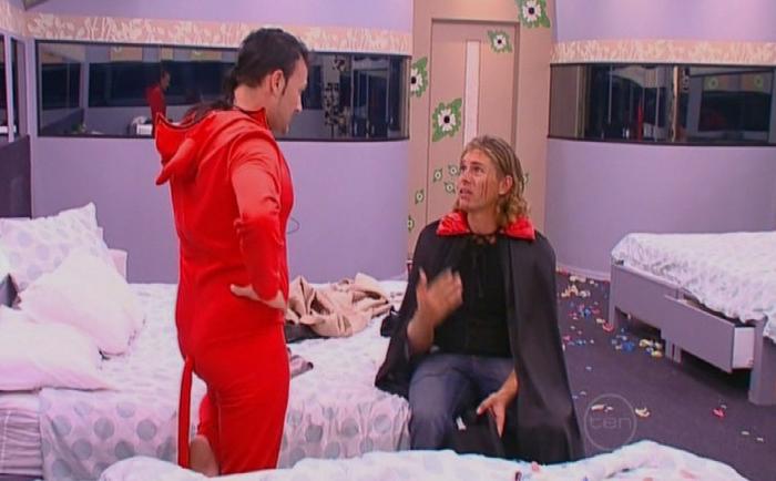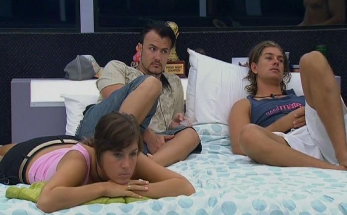Katie and Jamie are in the bathroom. Katie says she doesn't really have a problem with being nominated but can't look the other housemates in the eye any more. Jamie doesn't know what to think, he is obviously disappointed about being nominated. 8.41pm - Jamie, Katie and John are in the spa. Jamie is very annoyed and says that Camilla Rob and David are grouping together and are the main cause of them being nominated. John says at this point of the game it.s easy to vote strategically. Katie says she knows exactly her reasons for being nominated - her messiness and she just isn't fitting in at the moment. Katie says there are two sides going on in the house now. Jamie says he's tried to get along with Rob but it just doesn't happen. He says Rob's character is very sneaky and a bitchy person. Jamie knows Rob nominated him because Rob couldn't look at him afterwards. Jamie says there are three groups - them, the girls and the gays. The girls and the gays have banded together according to Jamie to vote out their group. John was suss about Claire. Big Brother calls all three of them to the diary room. Meanwhile in the sauna Gaelan and Ashley wonder why they are getting in trouble. To pass the time they start air guitaring and banging the water bucket as a drum. . 11.59pm - David asks Katie and Jamie about their nominations. They both thought they'd be up. Jamie says Gaelan and Ashley have sorta been off on their own and if there are people in their group people would have picked on it would have been Jamie and Katie. Katie begins talking about how she thinks she was nominated because of her uncleanliness. Big Brother interrupts and fines Katie for discussing possible nomination reasons. Katie: Drilled, so drilled! This has been a great night. BB then fines Jamie. He doesn't seem to care. Katie recaps: a nomination, a strike and a $5000 fine each in one night. Katie: This has been the best night of my life! Gaelan comments in the bedroom the couple must be taking their nomination pretty harsh and spiteful if these strikes and fines are happening. Claire says it shows the lack of maturity levels. David: Cheeky little bastards. Day 54Rob and David are having a chat in the bedroom. Rob asks how long David expects to be in the house. David doesn't know. Rob is saying his five weeks in the house feel like forever - every single minute is chewing him up. David knows what he's talking about, and wonders if he'll leave a hole in the house. Rob says he definitely will. Rob thinks everyone would get uptight. David is starting to think he really doesn't want to go this week. Rob says he should have thought of that earlier (when he took 3 points of Ashley). David says it wouldn't have changed anything if he took the points off himself. Katie and Ashley are playing a game in the living room where Katie has to "catch" a purple dot on Ashley's boardshorts. They scream and laugh. David says to Rob he would really like some peace and quiet around the house, but doesn't think it.s possible. While the discussion happens Katie and Ashley run around the bathroom. When they are gone David says it would be really good if Katie left the house - people would change. They are all saying she's a cool chick but they think it would be for the better if she left. Katie and Ashley finally finish their game and apologise to the boys lying in bed for the noise.